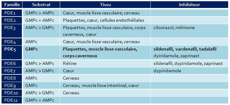 La phosphodiestérase 5 (PDE5) est une isoenzyme ubiquitaire, présente dans le tissu érectile mais également dans les parois artérielles et veineuses, les muscles squelettiques, viscéraux et trachéo-bronchiques, ainsi que dans les plaquettes.